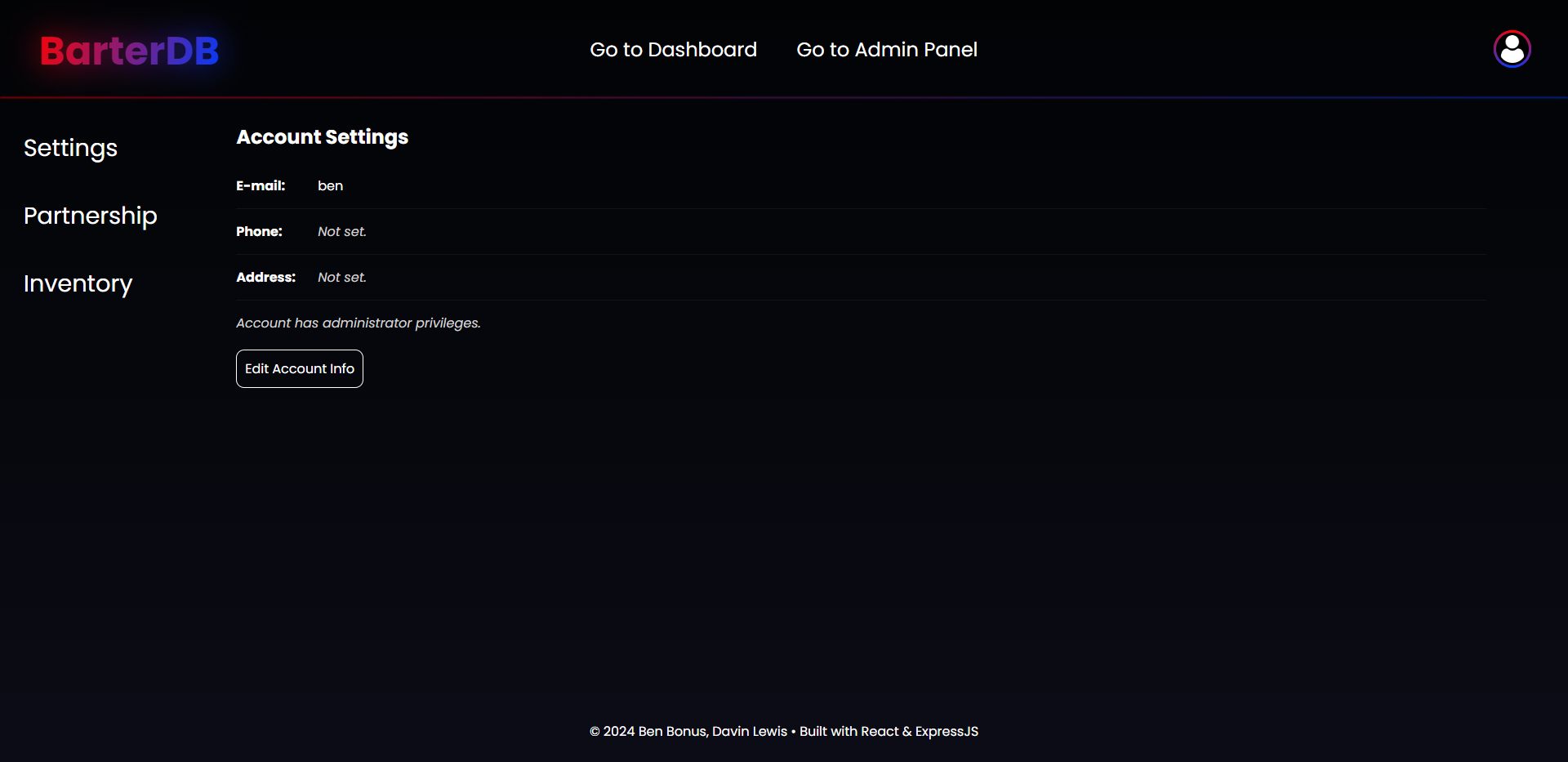 This is a full-stack website that I created for my CS-360 semester-long project. I worked alongside Davin Lewis, though I did the vast majority of the work on the application. The website is a place where users can form a partnership and trade items with other partnerships, all whilst remaining completely anonymous.