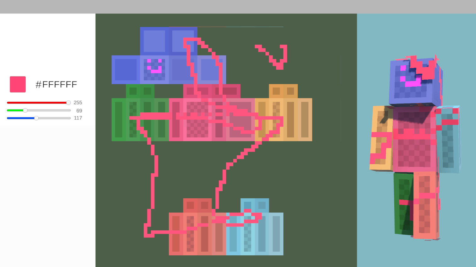 I was playing Minecraft one day and decided to make a new skin for my character. The tools that I found online were definitely usable, however I felt that they were lacking in some features that would have made it a lot more convenient. This sparked the idea of creating my own custom skin editor.